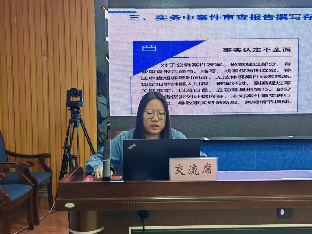 李婧同志以《法律文书制作(审查报告)实务操作》为题,从审查报告的基本内涵入手,详细阐述了审查报告的主要功能及写作重点,剖析了当前撰写中存在的主要问题,并结合自身工作经验,就如何撰写高质量审查报告、文书结构安排及制作要点等方面进行了系统讲解,内容详实,操作性强,有效提升了参训干警制作高质量审查报告的能力。