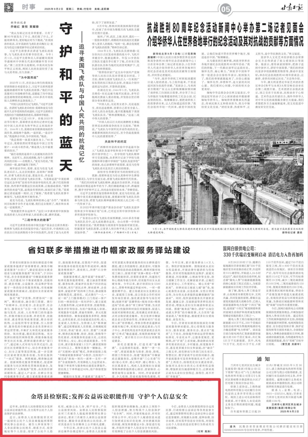 2025年9月2日,甘肃日报刊发《金塔县检察院:发挥公益诉讼职能作用 守护个人信息安全》。