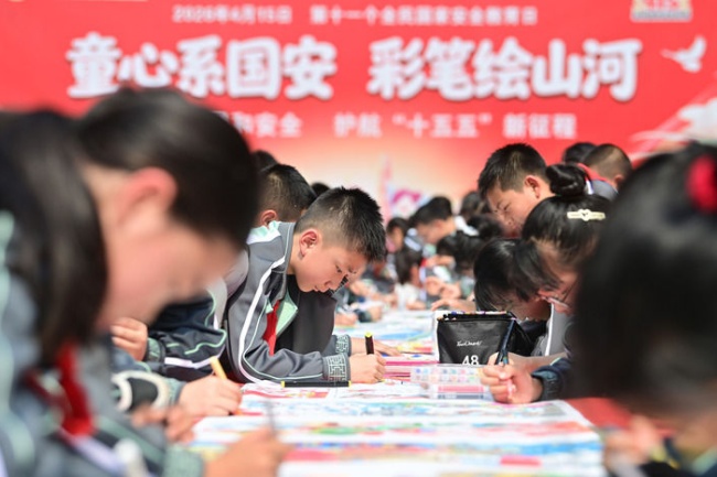 2026年4月10日,在江西省赣州市白云小学,学生们在创作国家安全教育主题绘画。新华社发(胡江涛 摄)