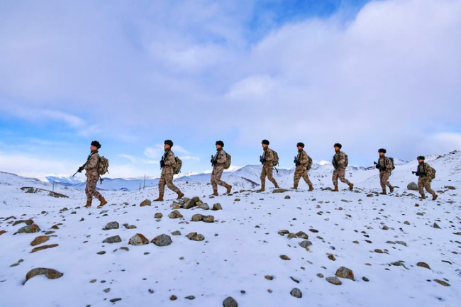 2024年2月9日,驻守帕米尔高原的新疆军区某边防团红其拉甫边防连官兵踏雪巡逻。新华社发(姬文志 摄)